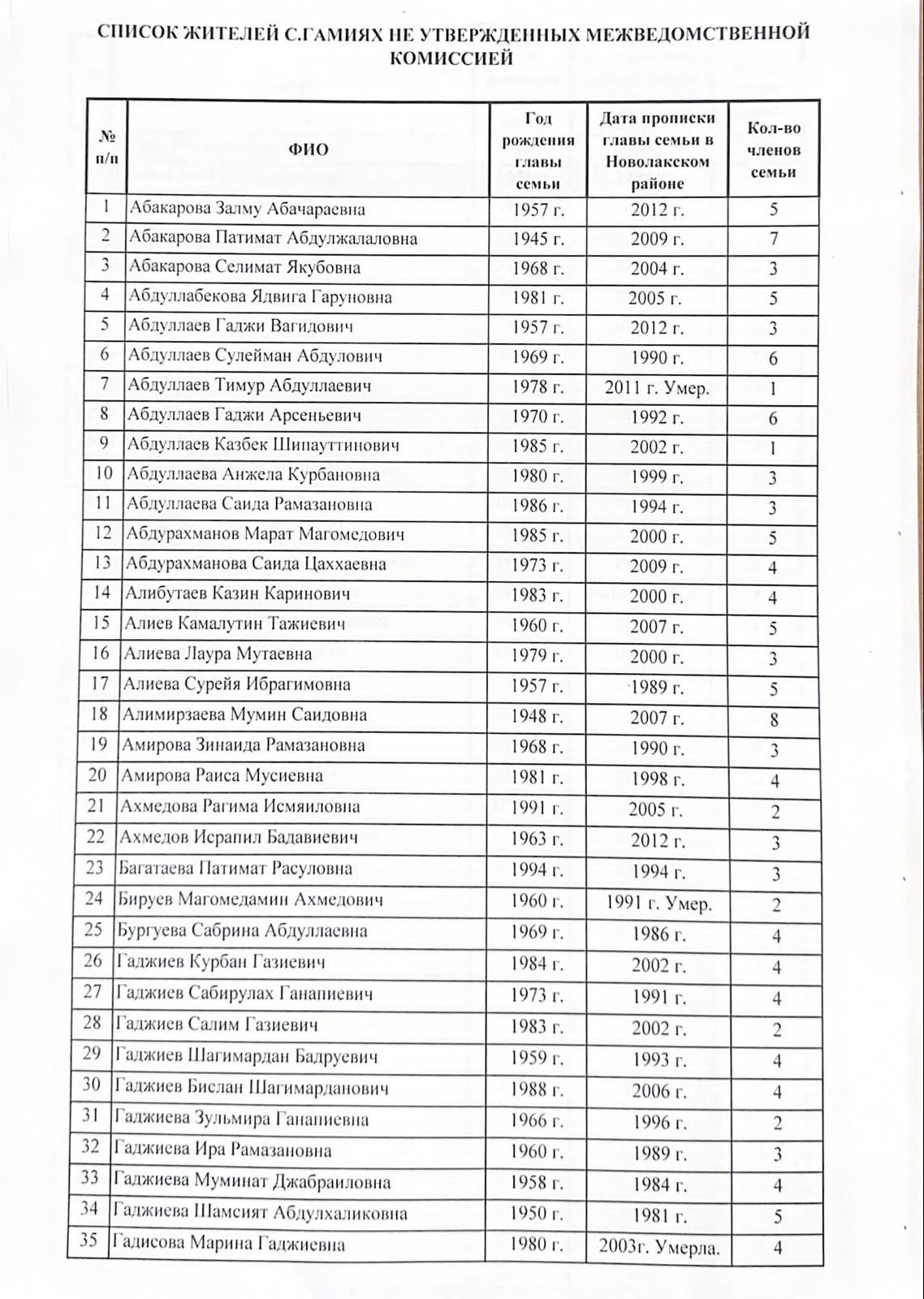 На рассмотрение межведомственной комиссии поступило 186 личных дел жителей с.Гамиях Новолакского района .Из них прошли комиссию -21, получили отказ-165. Нами размещены списки к данной статье в целях информирования населения и обеспечения открытости в проводимой работе межведомственной комиссией , а также для получения обратной связи от жителей с.Гамиях Новолакского района . Контактный телефон для связи 8(988)-777-65-56. Сулейман.